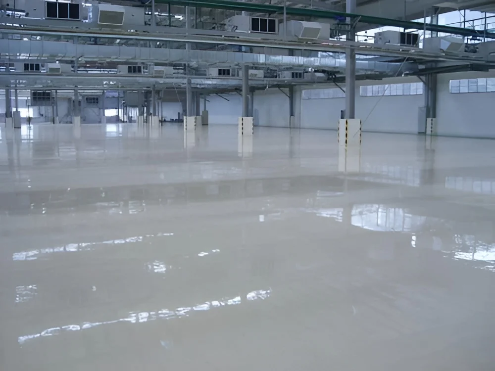 A polished office lobby floor with self-leveling epoxy creates a sleek, durable surface that can stand up to daily use. It shows how smooth and glossy the finish can be. Such floors are common in showrooms, hotels, and hospitals where a clean, attractive appearance matters.